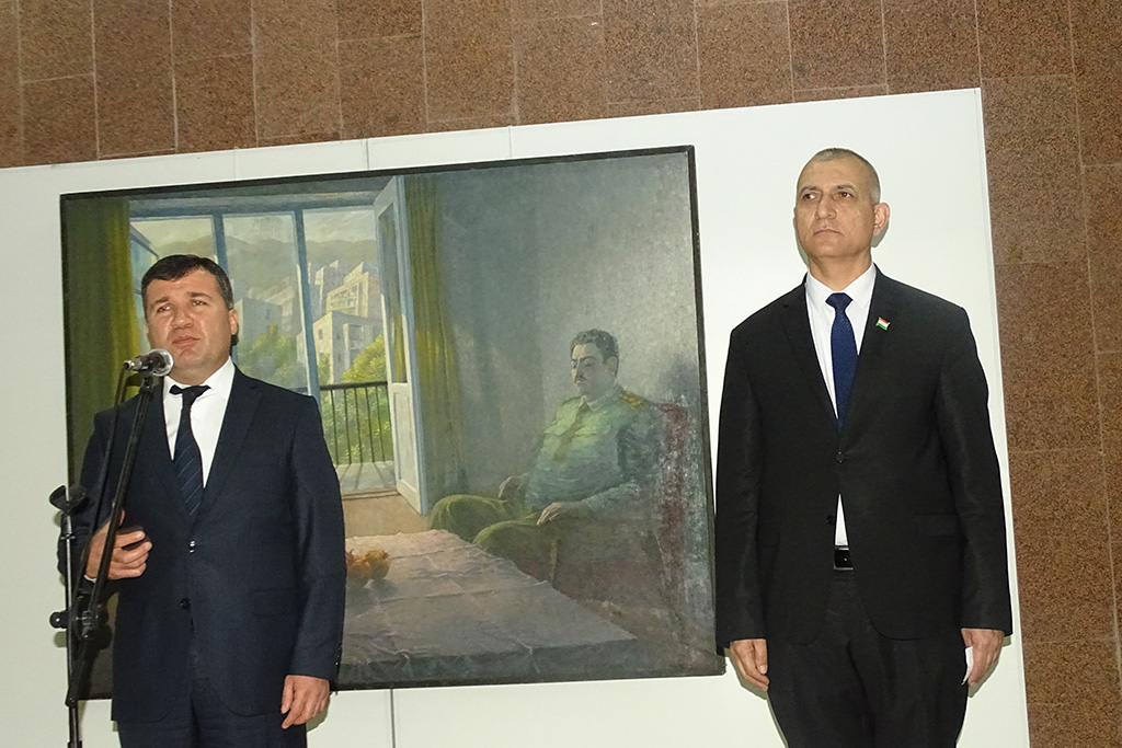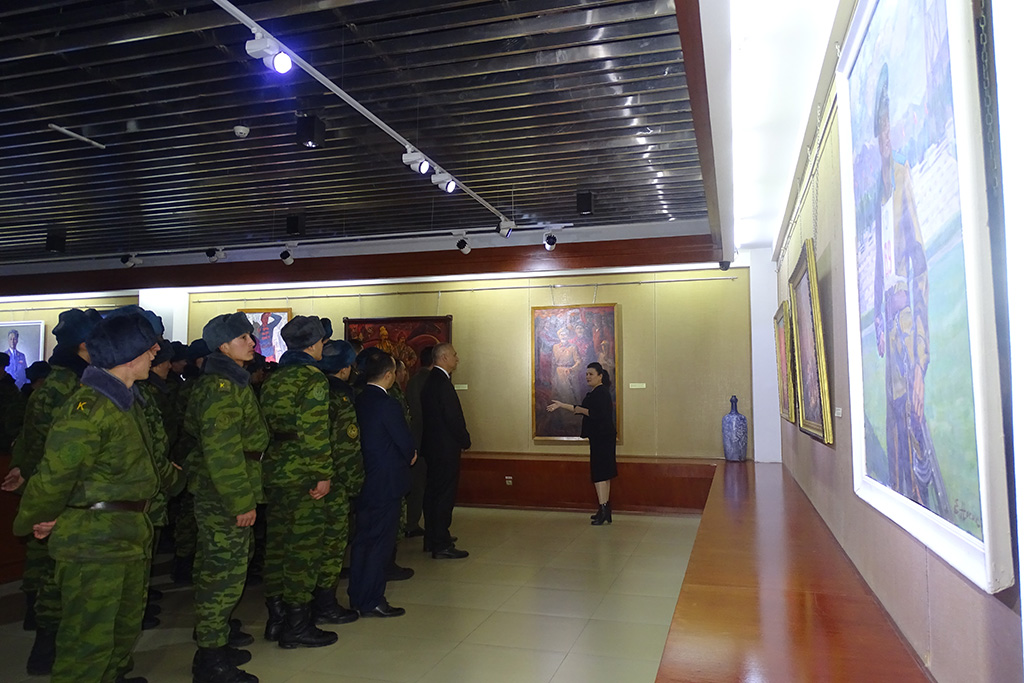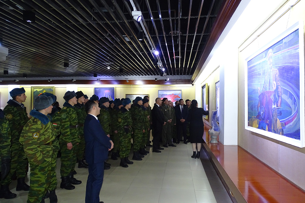 Дар намоиш зиёда аз 27 адад асарҳои беҳтарини рассомони Тоҷикистон аз қабили офаридаҳои Лисиков И. “Симои комиссари милитсия Умаров А.”, Камелин А. Н. “Сарбозон ба хона мераванд”, Буртсев Е. Г. “Сарҳадбонон”, Қурбонов С. “Подполковник Муродов фикр мекунад”, Абдурашидов Р. “Дилсӯзӣ”, Раҳимов А. “Аввалинҳо”, Оқилов А. “Бозгашти аскар”, Довутов З. “Симои сержант Копатилов А.” ва дигарон ба маърази тамошо гузошта шудаанд, ки дар онҳо эҳсоси ватандӯстӣ, ҳифзи марзу буми ватан ва ҷоннисориҳои родмардон нисбати кишвари худ таҷассум ёфтаанд.